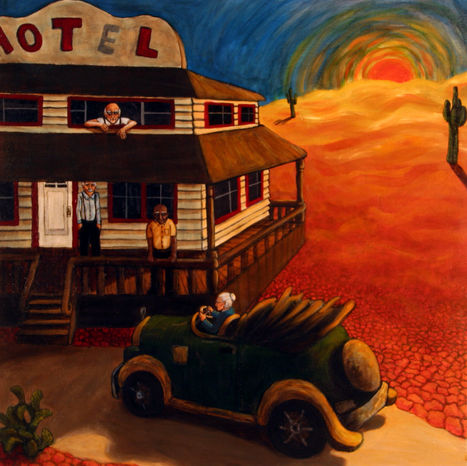 The Day It Rained Forever, by Ray Bradbury (© 1959)¹, tells of the stale lives of three elderly men who live in an abandoned hotel in a scorching desert. The men wait for the one day of rainfall each year, and when that particular day passes by without a drop one year, the men are close to despair. The arrival of Ms. Hillgood, a retired music teacher, at the front door of their lonely hotel brings a respite friom the heat for the shriveled men. Bradbury's story explores the persistence of hope, and the power of music to transform an environment. The pulsating heat oppressing the men on every side is washed away by the music of Ms. Hillgood's harp; it brings the sensation of flooding rain to the men, and with each note she touches, she restores their faith and quenches their thirst for beauty. My series of paintings describes Bradbury's plot, but more importantly seeks to capture the soul of his story.